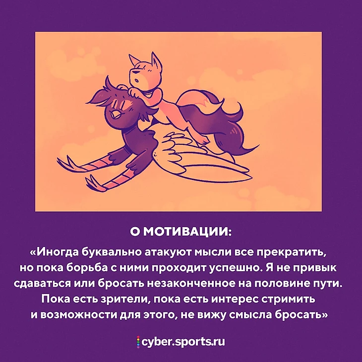 Иногда меня буквально атакуют мысли все прекратить, но пока борьба с ними проходит успешно. Я не привык сдаваться или бросать незаконченное на половине пути. В одном из гайдов, прочитанных мною перед началом карьеры, написано: «Неважно, решило с вами провести время 33 человека или 3, это их осознанный выбор». Считаю эту позицию верной. Пока есть зрители, пока есть интерес стримить и возможности для этого, не вижу смысла бросать. Тем более зачастую это игра в любимые проекты.