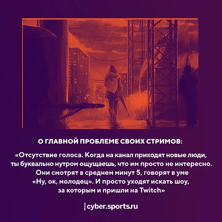 Проблема в моем случае – отсутствие голоса. Когда на канал приходят новые люди, ты буквально нутром ощущаешь, что им просто не интересно. Они смотрят в среднем минут 5, говорят в уме «Ну, ок, молодец» и просто уходят искать шоу, за которым и пришли на Twitch.