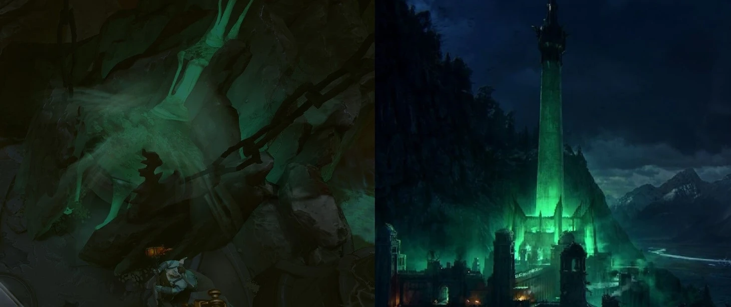 Фонтан Тьмы вызывает ассоциации с Минас Моргул, крепостью назгулов из романа «Властелин колец», своим зеленым свечением и туманом.