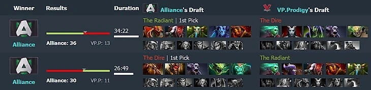 Несмотря на отличные результаты Prodigy на последних турнирах, статистика личных встреч команд сейчас 1:2 в пользу шведской организации. Единственная победа VP.P была как раз на Пушка-лиге, а Alliance, помимо вчерашней победы, одолели Prodigy в групповом этапе. Лишь команда S4 смогла выиграть у них серию до плей-офф.