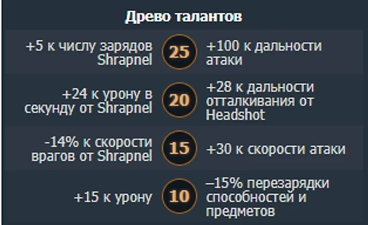 Отдаем приоритет Шрапнели и Хэдшоту. Третий спелл не качаем до 11-го уровня, играя за поддержку много профита от него все равно не получить. К седьмому уровню имеем замакшенную шрапнель, к девятому – хэдшот.