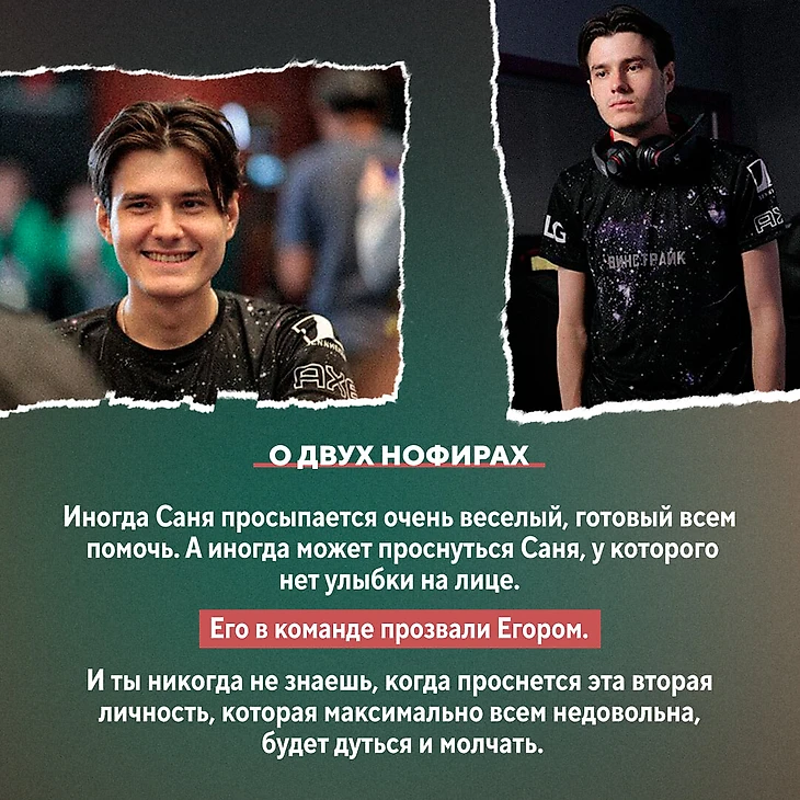 – Когда мы играли на квалификации на TI, пацаны в команде заподозрили, что иногда Саня просыпается очень веселый, готовый всем помочь и позитивный. А иногда может проснуться Саня, у которого нет улыбки на лице. Его в команде прозвали Егором. Вот есть Саня, а есть Егор. И ты никогда не знаешь, когда проснется эта вторая личность, которая максимально всем недовольна, будет дуться, молчать и найдет сто причин, чтобы все друг на друга кричали. Вот это его проблема.