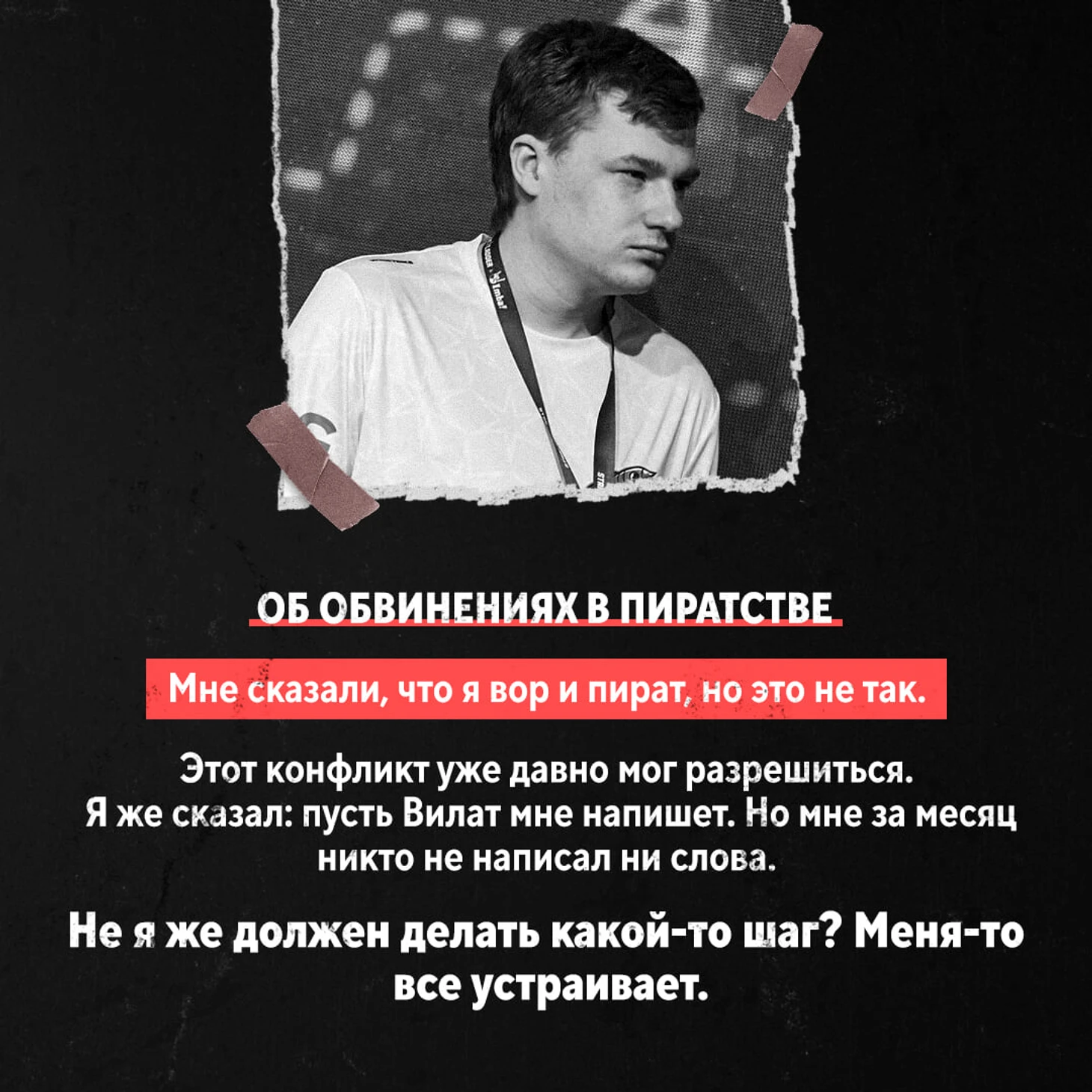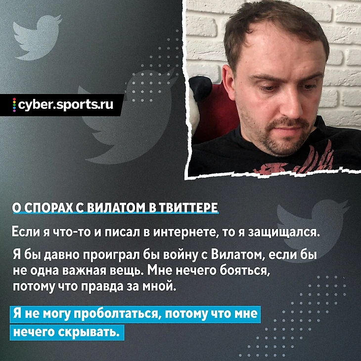 Я бы давно проиграл бы войну с Вилатом, если бы не одна важная вещь. Мне нечего бояться, потому что правда за мной. Я не могу проболтаться, потому что мне нечего скрывать. И Веталь первый раз, наверное, за все перепалки в твиттере, встретил такое. Про меня нечего сказать, потому что я ничего не прячу.