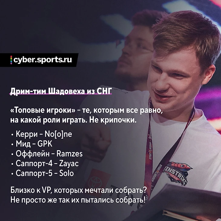 – Я бы сделал все по-умному. Что такое «топовые игроки» в моем понимании? Это игроки, которым все равно, на какой роли играть. Не крипочки. Если выбирать из СНГ, то я бы взял Рамзеса на оффлейн, Gpk на мид – молодую кровь. Нуна мы бы подтянули на керри, он бы у нас там развивался. На четверочке у меня был бы Зайчик. А на пятерку мы бы посадили Соло. Вот такой у нас был бы состав.