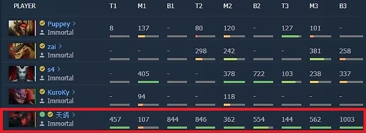 Все эти движения привели к тому, что у Артизи на 6-й минуте было всего 9 крипов (4-е место с конца). Но СФ всегда был способен быстро фармить леса, поэтому уже к 10-й минуте Артур вышел на первую строчку по числу добитых крипов!