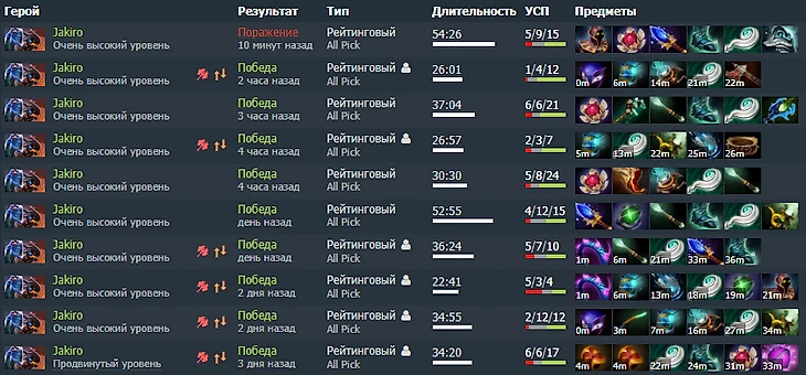 На данный момент я отыграл ровно 10 матчей на хардовом Джакиро. К моему удивлению винрейт составил 90%. Возможно, это связано с небольшой выборкой, поэтому я отыграю еще пару десятков матчей, чтобы цифры пришли к адекватным значениям. Выводами из прошедших игр я сейчас поделюсь с вами.