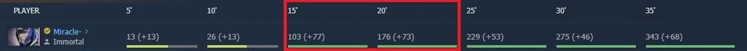 Результат таких действий – идеальный фарм Луны. 77 крипов за отрезок с 10-й по 15-ю минуту – очень много.