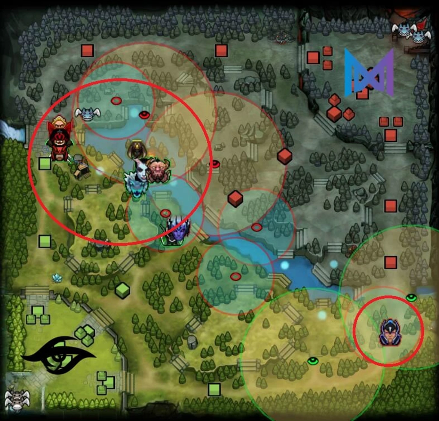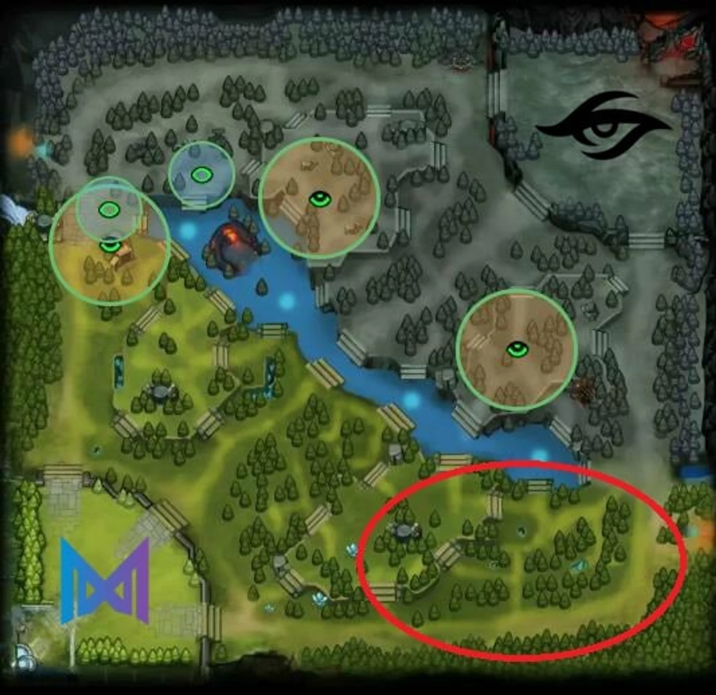 Чаще всего защитный обзор ставится по периметру области фарма кор-героев. Но Куроки идет дальше и ставит обзор на плацдарм возможных атак противника, контролируя смок-ганги. Пример – 2-я карта против Сикрет на Blast. Область фарма Миракла на Луне – большой лес Radiant и нижняя линия.