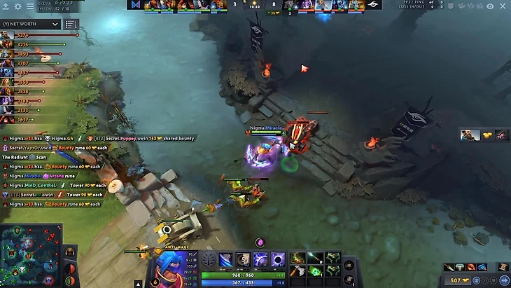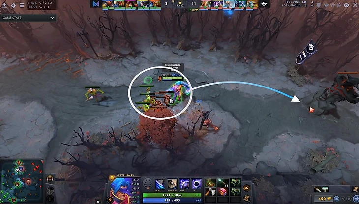В центре видно, что Кункка и Энча фармят крипов. У Нигмы сейчас нет ресурсов для успешной драки, да и герои Сикрет из леса Radiant быстро включатся в тимфайт. Это – сильная линия.