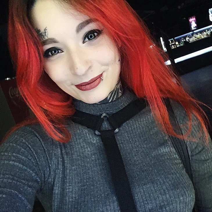 Отличительная черта Кати – ее внешность. Тело девушки украшает большое количество татуировок (более 40 штук), а также волосы красного цвета. Выглядит эффектно.