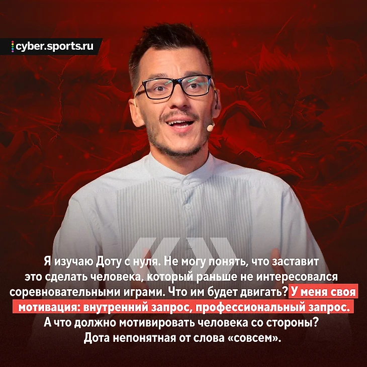 Мне легче - я играю в доту уже 15 лет, но мной до сих пор движет желание стать лучше в лучшей игре, в необъяснимой, непонятной игре. Вспоминаю сцену из "Убить Билла": если ты хочешь есть как собака - будешь жить и спать как собака. Я живу на 3-4 к, как собака, но я знаю, что дота - это великая игра, и я просто не смог достичь мастерства.