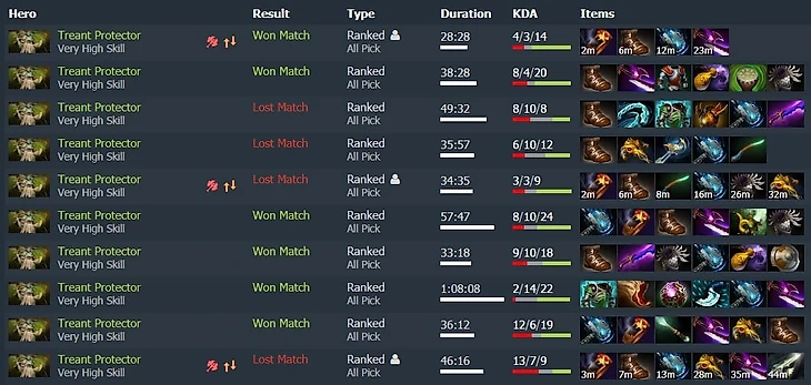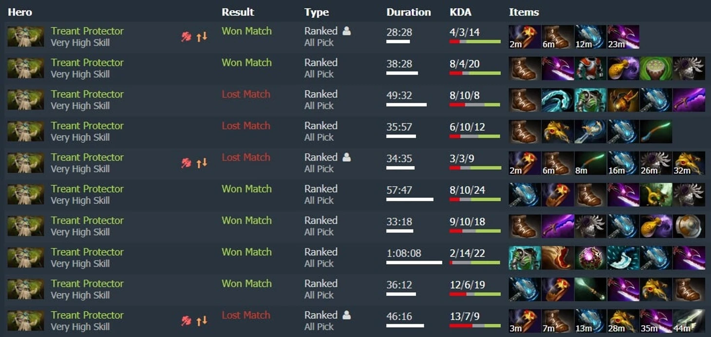 Перед началом игр на Тренте я, сказать честно, совсем не верил в успех. Как минимум потому, что я нарушил все законы игры на этом герое. О том, что именно мы нарушили – чуть ниже, а пока что статистика за 10 матчей.