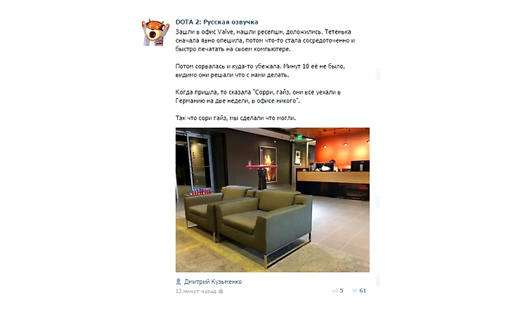 Естественно, дальше анонса озвучка этих героев не пошла. Когда и это не помогло, Дмитрий Кузьменко лично полетел в Сиэтл в офис Valve. Но увез оттуда лишь фото лобби.