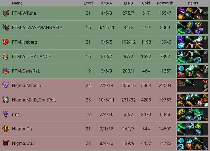 Игра получилась очень ровной, несмотря на наличие стендинов. Lebron отыгрывал без явных ошибок, а по исполнению Rmn- видно, что он в тесном контакте с командой и понимает, как играет его коллектив. Ни одна из команд не получила серьезного преимущества после 20-ти минут игры, но потом FTM провела удачную драку и вырвалась вперед на 10k, тут еще сказывается в преимущество Магнуса по игре - он очень эффективно фармит по сравнению с мидером оппонента - Войд Спиритом. Игру решила драка около вардплейсмента в верхнем лесу сил света - грамотная позиционка от Nigma благодаря хорошим вардам дали им возможность отыграть все преимущество соперника, Затем они забрали Рошана и снесли половину нижней линии оппонента. Через несколько минут забайтили Iceberg'а на слепое РП на Магнусе, после чего уверенно выйграли драку и закончили карту.