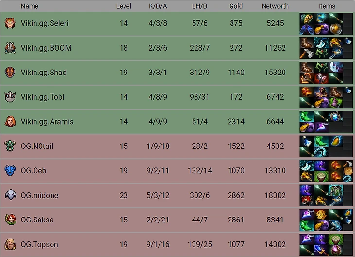 Честно скажу, что на этой карте пик мне больше импонировал у Викингов и они были довольно близки к победе в определенные моменты. Связка Дум+Гримстрок у них работа не только на бумаге, но и на практике, а Клокверк с Веномансером были серьезной проблемой в начале и мидгейме. В ключевые моменты OG оказались опытнее, а в какие-то моменты просто наглее. На Инковера просто напрашивалась линка или хотя бы бкб, но Topson выбрал более агрессивный октарин и все равно выйграл. Отметим очень уверенную игру MidOne на первой позиции - все таки когда-то именно на ней он и начинал делать себе имя. Первая карта за OG