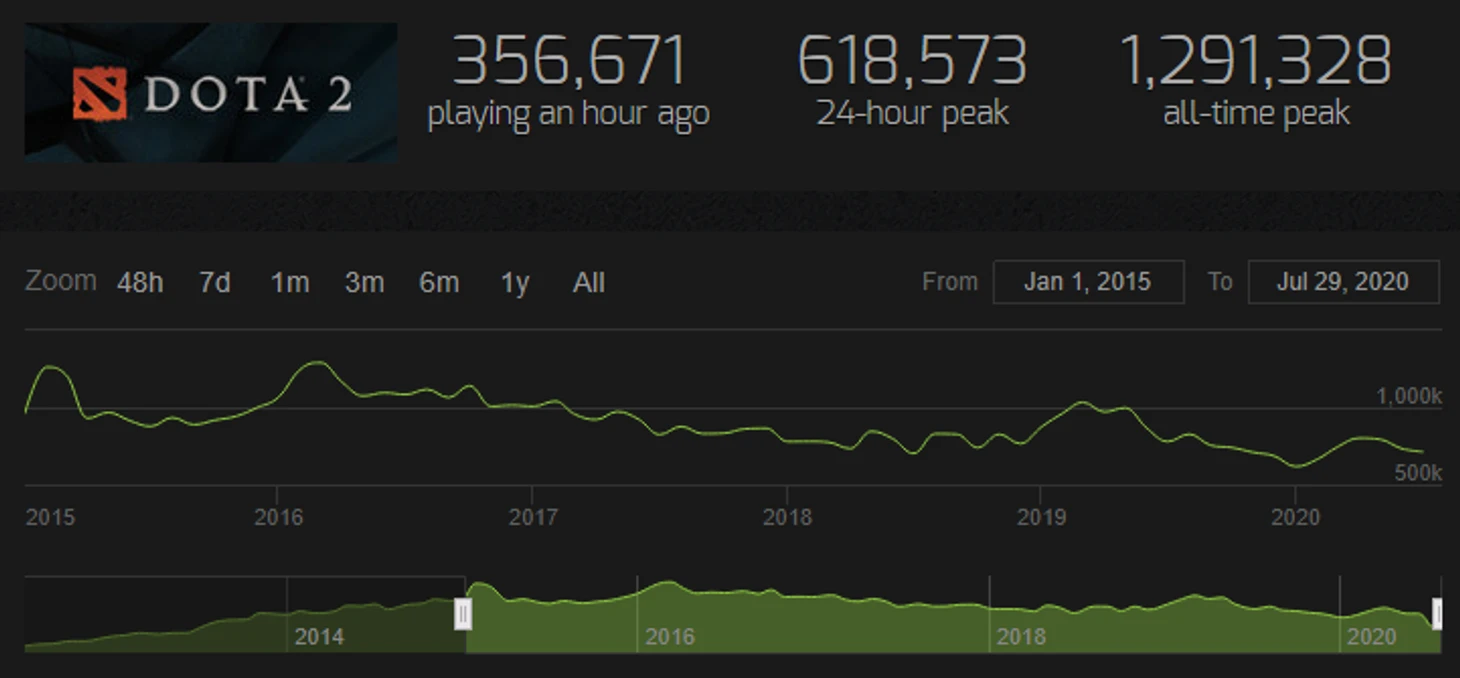 Чтобы говорить о будущем, нужно иметь четкое понимание – в каком состоянии Dota 2 находится сейчас. Сделать это не сложно. Игра стагнирует. В плане аудитории даже немного деградирует, но не критично. Вам не нужно верить мне на слово, за меня будут говорить цифры.