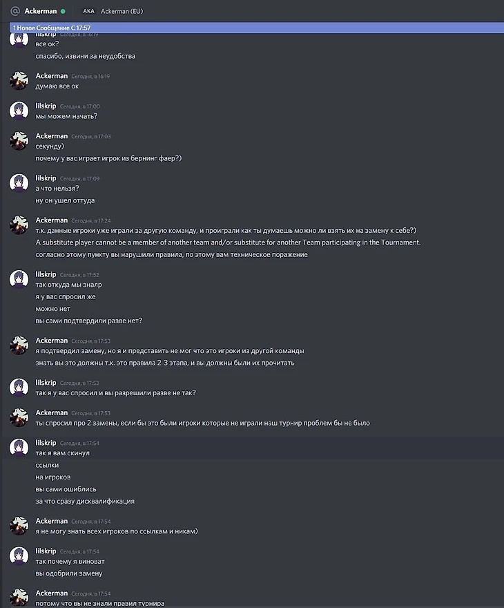 И только после этого админ написал мне, что мы нарушаем правила. Игра началась в 17:04, в 17:09 я отвечал ему уже на стадии драфта. После игры я открыл дискорд и увидел сообщение о дисквалификации, которое пришло прямо во время карты.