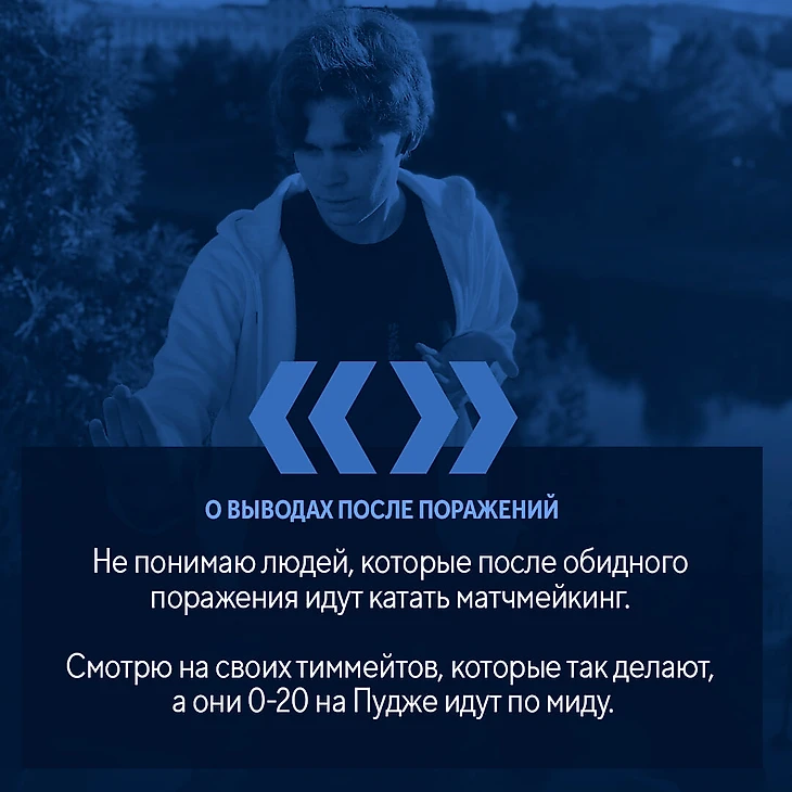 Вообще я не понимаю людей, которые после обидного поражения идут катать матчмейкинг. Я ни разу не видел, чтобы они потом хорошо играли. Обычно я смотрю в этом случае на своих тиммейтов, которые так делают, а они 0-20 на Пудже идут по миду.