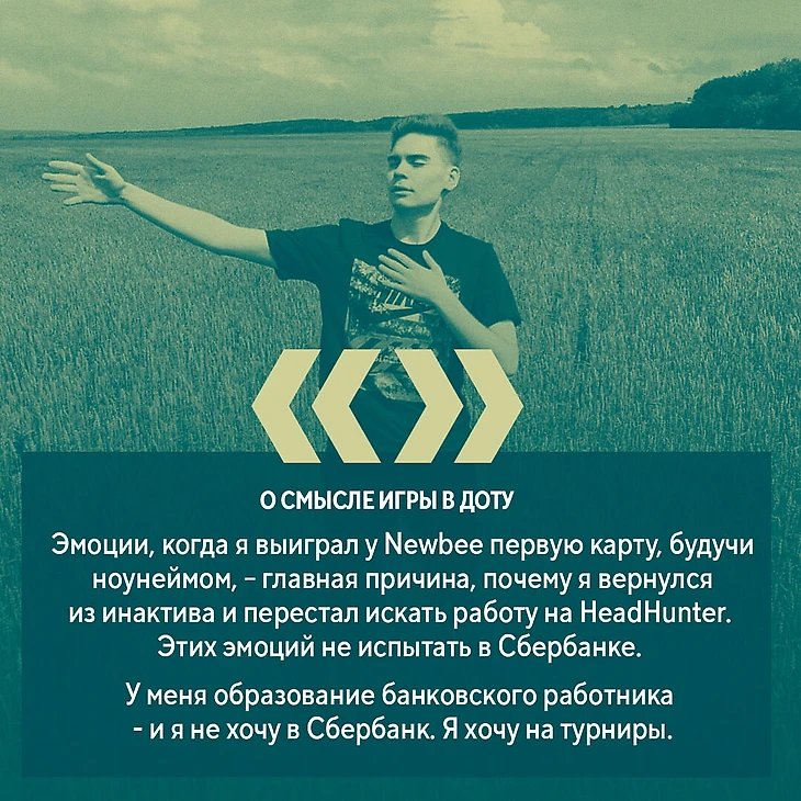 Я хотел заново испытать эмоции, которые я почувствовал, когда мы с Империей приехали в Шанхай и играли против Newbee. Тогда они были топ-2 TI и всех разрывали. И вот те эмоции, когда я выиграл у них первую карту, будучи ноунеймом, – это главная причина, почему я вернулся из инактива и перестал искать работу на HeadHunter. Этих эмоций не испытать в Сбербанке. У меня просто образование банковского работника – и я не хочу в Сбербанк. Я хочу на турниры.