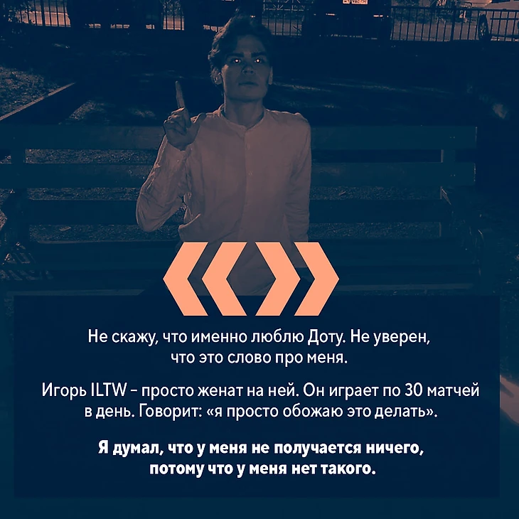 Я не скажу, что я именно люблю Доту. Не уверен, что это слово про меня. Вот Игорь ILTW – это идеальный пример такого состояния. Он просто женат на ней. Не видел никого такого. Он играет по 30 матчей в день. И на любой вопрос о том, зачем он это делает, он говорит: «я просто обожаю это делать».