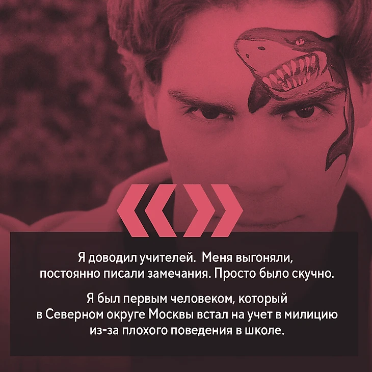 – Доводил учителей. Меня выгоняли, постоянно писали замечания. Мне просто было скучно, и я хотел себя так развлечь. Меня даже на учет в милиции ставили! Я был первым человеком, который в Северном округе Москвы встал на учет в милицию из-за плохого поведения в школе. При этом я никого не материл, не издевался. Максимум – хамил, когда ко мне предвзято относились.