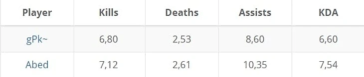 Конечно, глядя на статистику, нужно постоянно делать скидку на разницу винрейта Абеда в GPK в этом сезоне, а она составляет почти 20% (70,1% побед против 51,6%). Тем удивительнее видеть равные показатели по фрагам и смертям (ГПК даже реже погибает!), а вот в ассистах сразу видно первое различие – Абед куда чаще подключается к дракам.