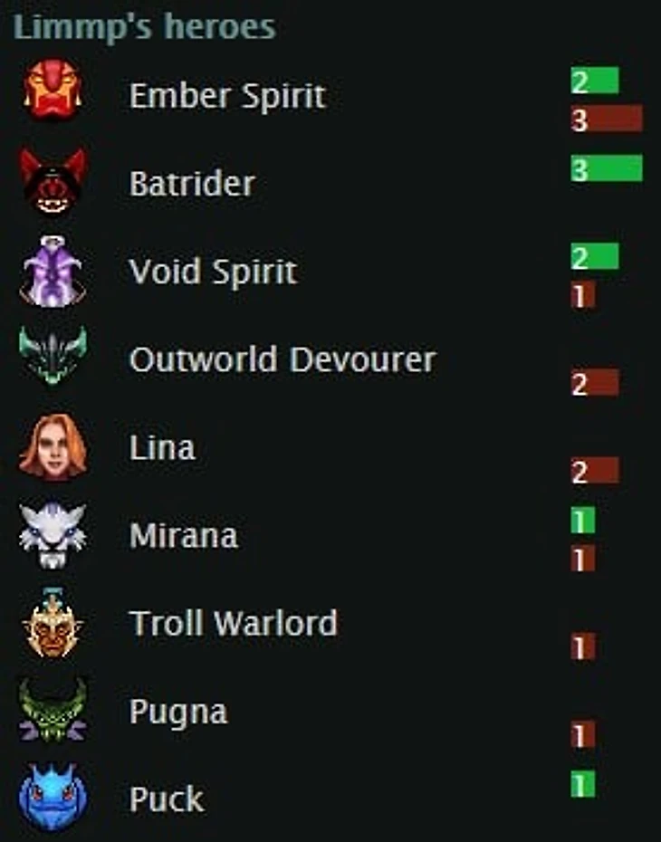 Плюс Лимп на нем неплохо играет: 4 победы и 2 поражения с КДА 5,72 в играх за Альянс. У Вихи, который спамит этого героя в пабах, 87,5% побед и 4,58 КДА за последние 3 месяца в про-играх. Также Бэт – второй по популярности герой Лимпа в пабах на этой неделе (3 победы в 3 играх).
