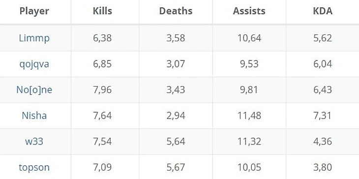 Напомню, что при анализе статистики игроков важно помнить об общем винрейте команды: Ниша, конечно, монстр по KDA, но у него 80% побед – ему показывать лучший KDA легче, чем кому-либо в этой таблице.