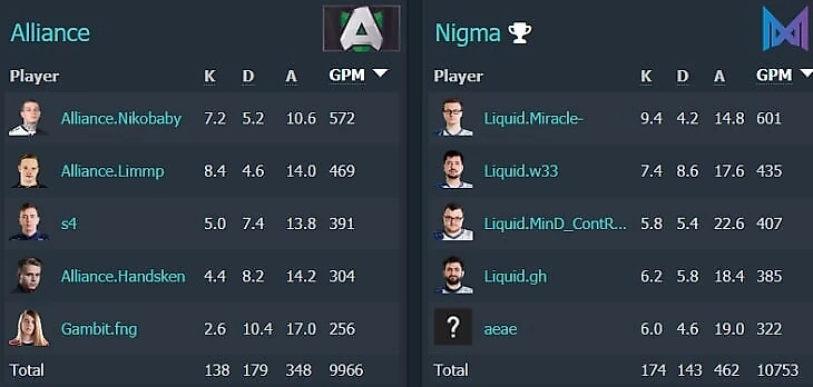 • Limmp забирает свое ассистами, которых у него аномально много. Alliance и по этому показателю последняя в списке (56,20), но Limmp обгоняет Койкву (у Liquid 59 ассистов на команду), Нуна (56,22) и Топсона (60). В старом ростере Alliance Лиммп набирал больше ассистов, чем оффлейнер и саппорт команды, и это нетипичный перекос для Доты.