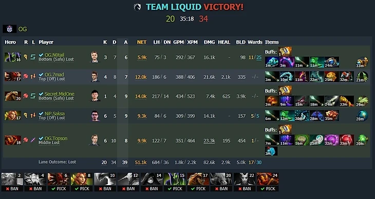 Сегодня на первой карте против Liquid OG практически повторили драфт Пуппея. Но никакой уверенности не было: только поражение на всех линиях из-за странной расстановки героев. Рубика зачем-то отправили на пятерку, вместо того, чтобы взять сильного героя на линию, ВР-ку сделали четверкой, несмотря на то, что это универсальный герой, который стоит любые матчапы.
