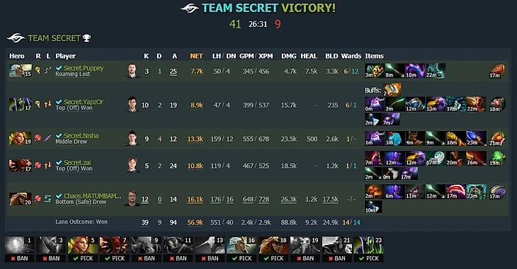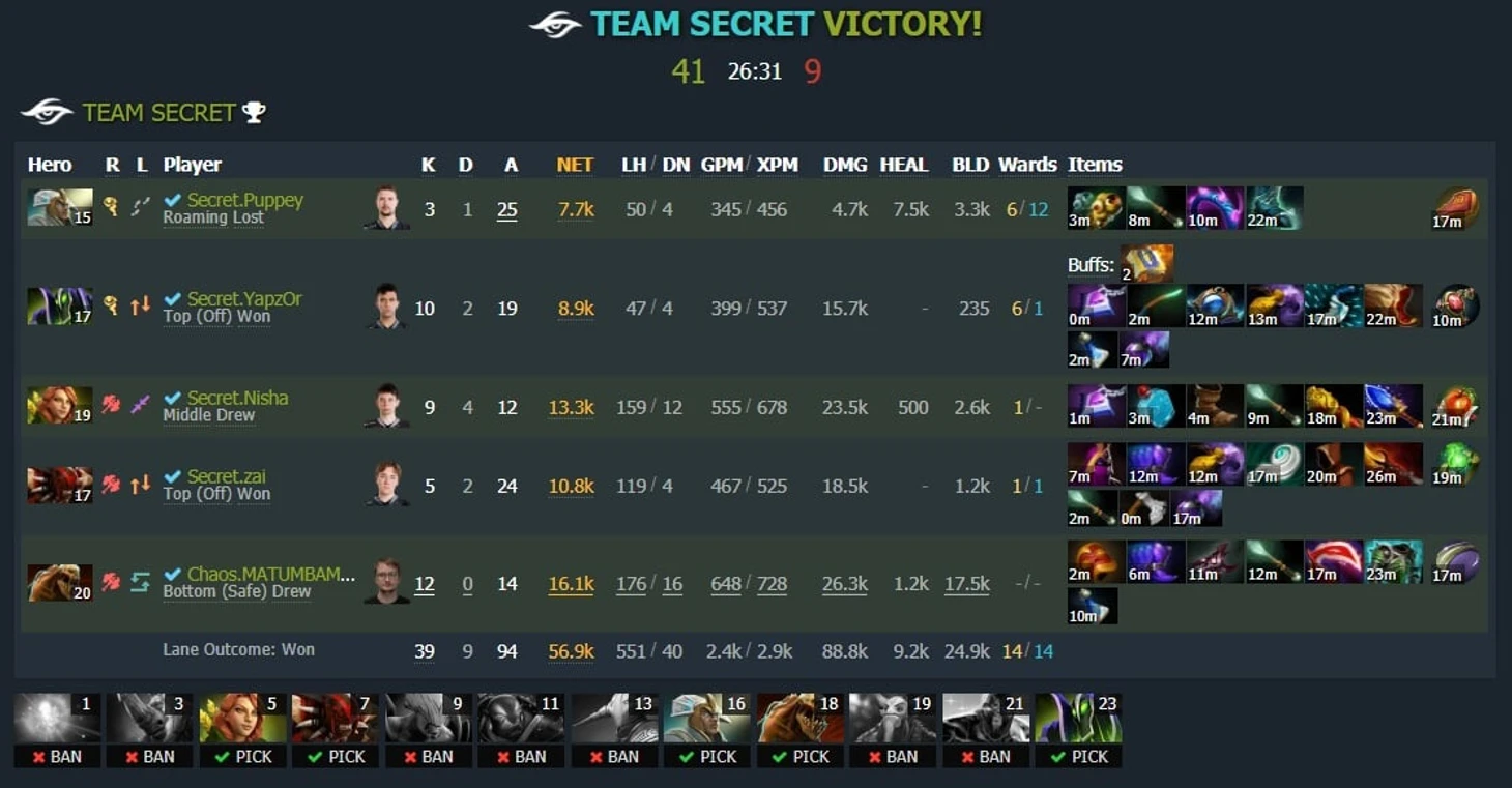 Обе игры против Team Secret OG брала себе Сикера и ВР-ку. Перефарм Secret шел по графику 1000 в минуту, а единственной интригой матча стал нетворс Пуппея – комментаторы и зрители гадали, сможет ли он обогнать по фарму вражеского Инвокера.