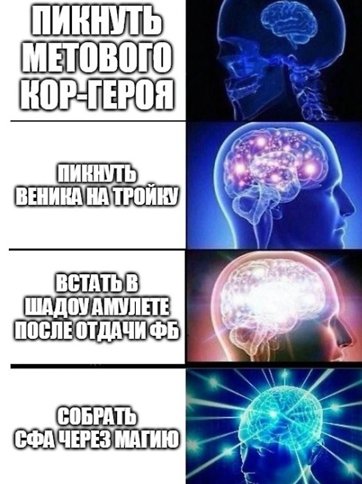 Представьте, что вы — СФ. У вас есть возможность пойти уничтожать людей с руки, не запариваясь над раскойловкой после 15-20 минуты или показать какой ты «супер-мега-скилловый чувак» и собрать Еул, Хекс, Этериал и подобные штуки. Что выбрать? «Сверхразум» скажет — я пойду в магический билд!