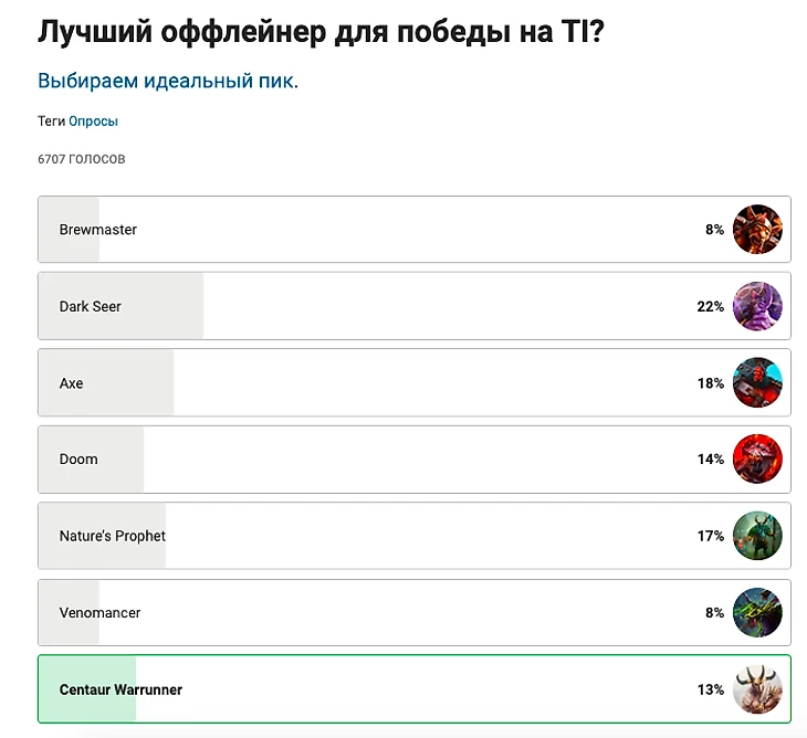 Привет! Мы проводим голосование за лучший пик, который способен победить в финале The International. Первые три опроса уже закончились – в них победили Faceless Void, Storm Spirit и Dark Seer. С этих героев начинается наш идеальный пик.