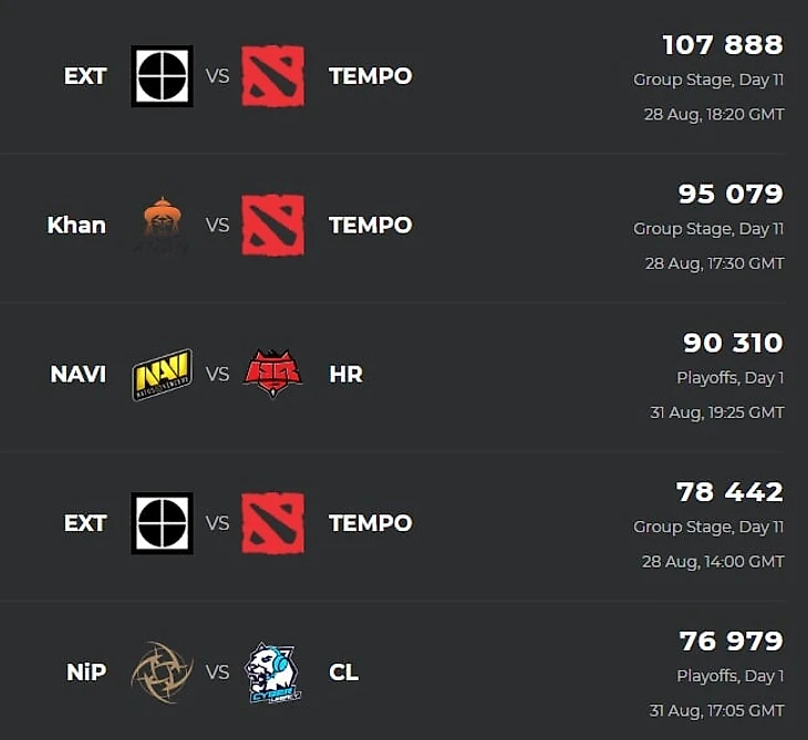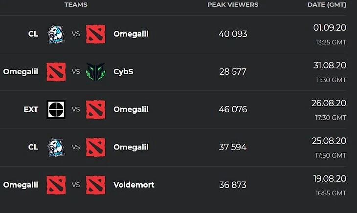 Второй аргумент Лила – про команд из Immortal-дивизиона в Divine – звучит нелепо от человека, игравшего в Virtus.pro и разогревавшего толпу колкими твитами. Он не может не знать, на чьи матчи чаще ходят зрители. Вот топ-5 пиковых значений Divine-лиги, для сравнения с Omegalil: