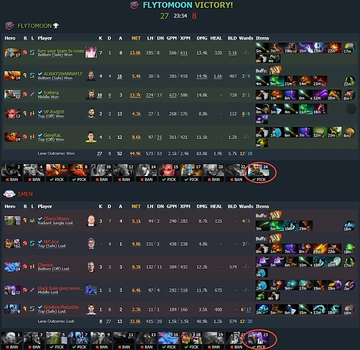 Как я уже сказал, перестановки на линиях в матчах плей-офф без участия топ-5 встречались лишь 4 раза, причем в обоих дивизионах. Дважды они случились в сериях FlyToMoon – 5men. В первый раз линии менял скандинавский стак – получилось совсем плохо. Команда взяла на 23-й пик Dark Seer. Увидев Kunkka на закрывающий, 5men, видимо, решили, что Puck доставит линии Phantom Lancer+Phoenix больше проблем, чем Dark Seer, а DS, в свою очередь, вынесет свое с линии против пирата.