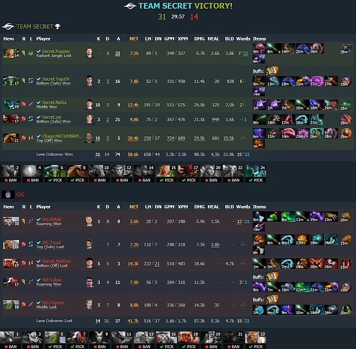 Secret, как я уже говорил, много переставляют линии и по своей инициативе. В отличие от Nigma, они редко заставляют zai покидать офлейн, зато на постоянной основе меняют местами Matumbaman и Nisha – финн имеет опыт игры в центре, а поляку дают героев, на которых он развалит с любой линии, например, Ember Spirit или Morphling (этому способствует игра Puppey, который здорово оставляет опыт на линии своему кору).