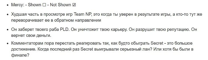 На оффлейн отправили еще одного корейца, Форива из MVP. Итак, Клемент сделал ставку на пару игроков из ЮВА. Но первый громкий инфоповод Secret в том сезоне был связан не с игрой. В октябре EternalEnvy выложил блог, где разнес организацию за неуплату призовых, вранье со стороны Пуппея и постоянные рейджи капитана.