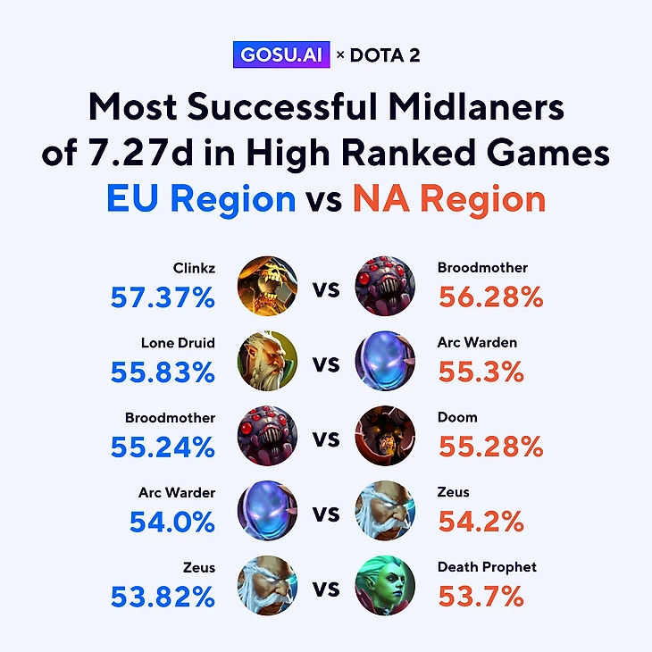 Зевса также достоин упоминания, герой оказался в топ-5 листе обоих регионов. Зевс в последнее время стал очень популярен в профессиональных играх, принося много побед в тир-1 матчах. Его новая сборка через замакшенный Arc Lightning позволяют ему без труда нафармить ключевые артефакты, после чего привнести огромный импакт на средней и поздней стадиях игры.