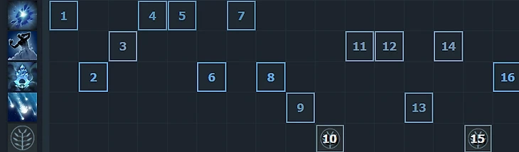 Общий паттерн таков – максим Нову для фарма и харраса, подкачиваем ауру для спама и пассивной помощи другим линиям и берем Frostbite в один, чтобы сбивать телепорты и фармить больших крипов.