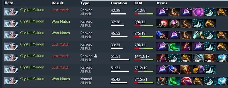 • Crystal Maiden – All-in герой в мидгейме. Она или убивает всех ультой и догоняет скиллами, или умирает за три секунды. Плотности нет, мобильности тоже.