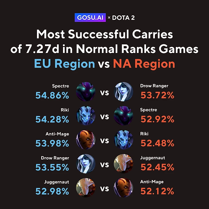 Самым успешным героем Европы стала Spectre. Сильный лейт-гейм персонаж, которого к тому же недавно понерфили, всё также остается на вершине винрейта и продолжает выигрывать игру за игрой.