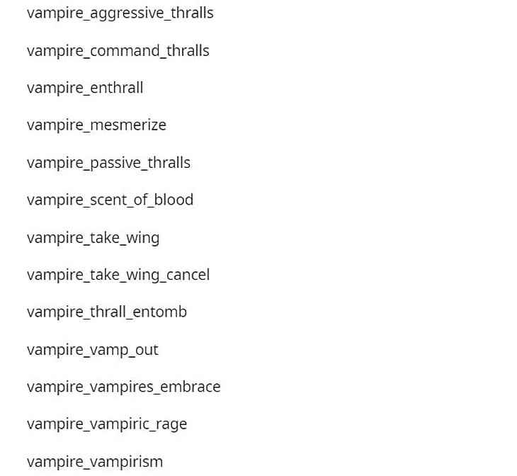 vampire_vampires_embrace_bonus_stolen_attributes, vampire_vampires_embrace_bonus_stolen_health. Способность крадет статы и ХП цели.