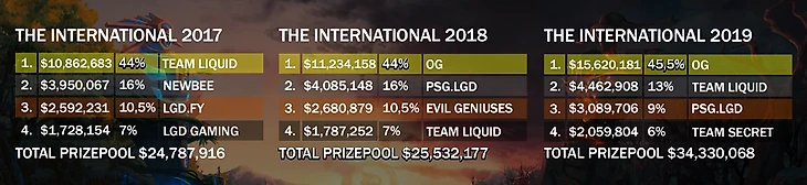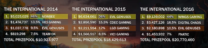 • К TI4 доля победителя снизилась до 46%, ровно столько, чтобы гарантировать, что каждый выигравший игрок получит миллион долларов. Затем опустился до рекордно низкого уровня 36% для TI5, прежде чем снова подняться до 44% для TI6, TI7 и TI8.