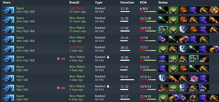 2. Разор – один из двух мидеров, на которых я действительно умею играть, и играл я на своей привычной линии. Комбо! Я даже думал снимать оценку до девяти, но во время фарма жетонов на саппорте я попался с еще одним Разором с оффлейна! Мне не понравился его билд на линии (из-за него он ушел с нее с 0-2), но знаете что? Он все равно внес кучу импакта на карте и был самым полезным кор-игроком.