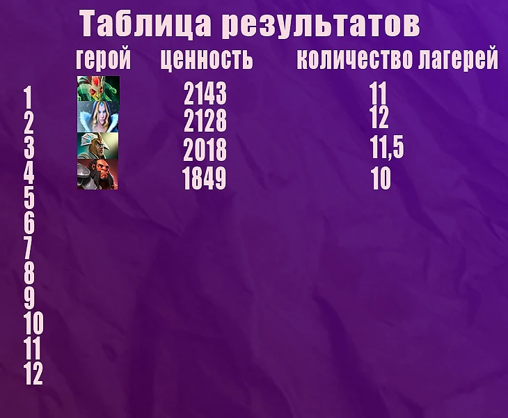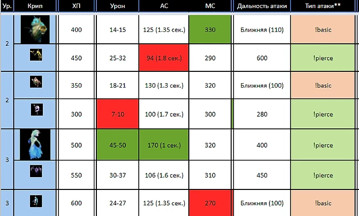 Рассмотрим таблицу от игрока с ником Sikle, в которой указаны типы атак всех лесных крипов: