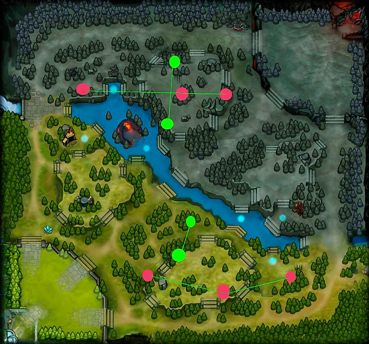 Фармим эти две точки, пока скорость убийства не будет достаточной, чтобы успеть застакать другой лагерь средних крипов;