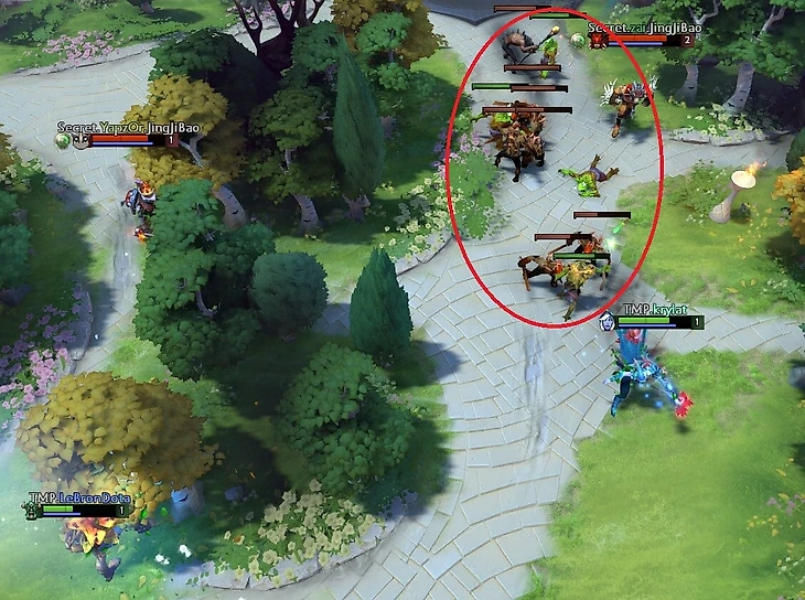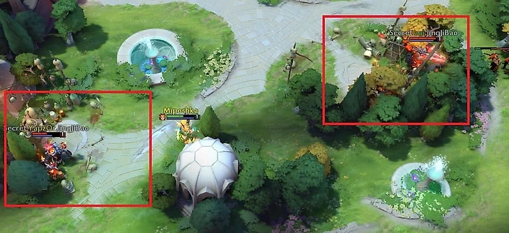 А так Зай ломает отвод, когда крипы уже бьют нейтральный лагерь. Очень просто, но эффективно – даже на нейтральном лагере лейн-крипы переагриваются после нажатия ПКМ на героя противника. Так он вытягивает крипов на проходящую мимо союзную пачку, создавая область в которую дабла противника подходить не хочет.