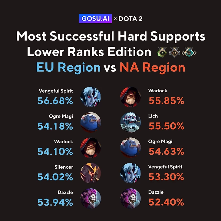 Топовые саппорты на низких рангах в патче 7.27d. Европа против Америки