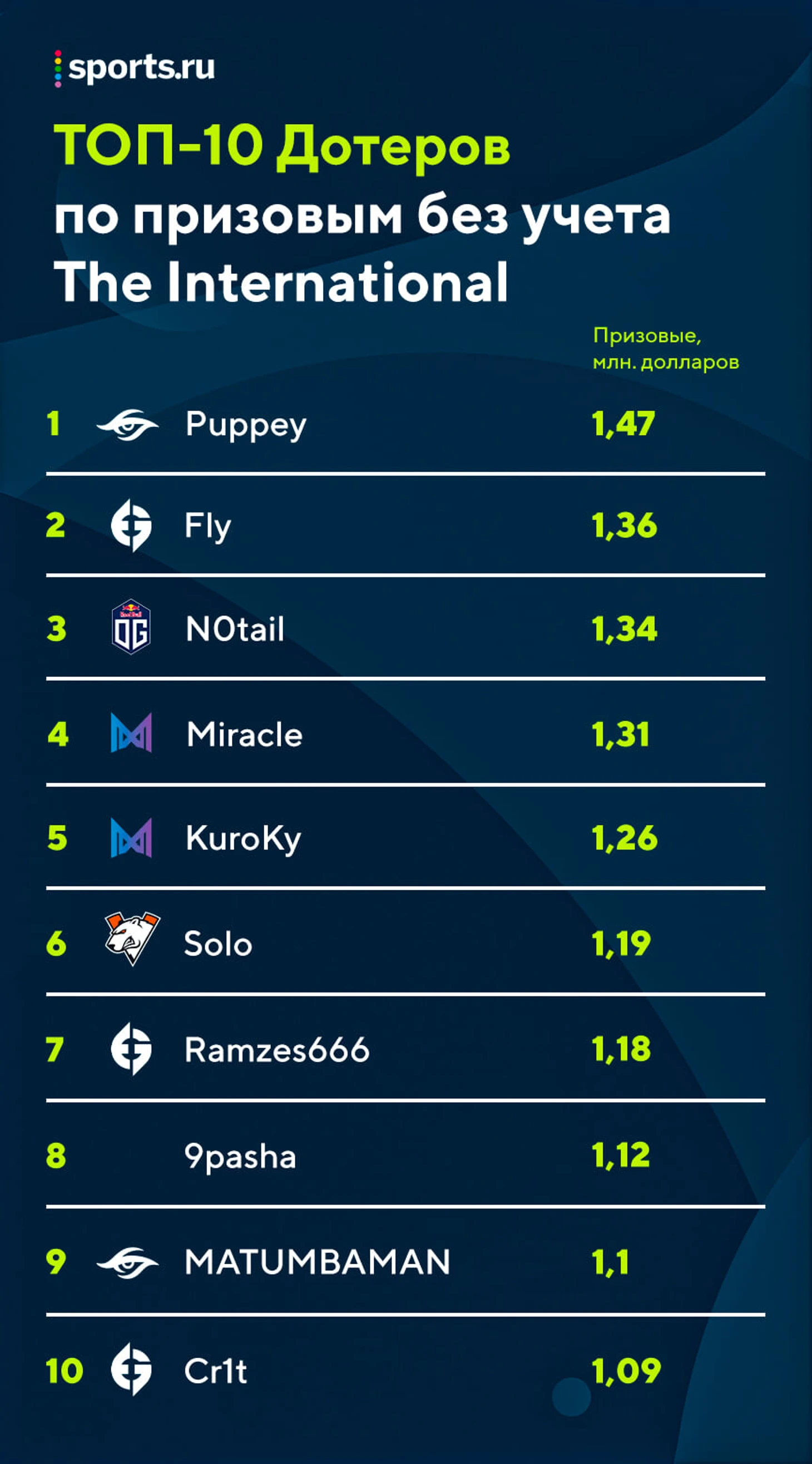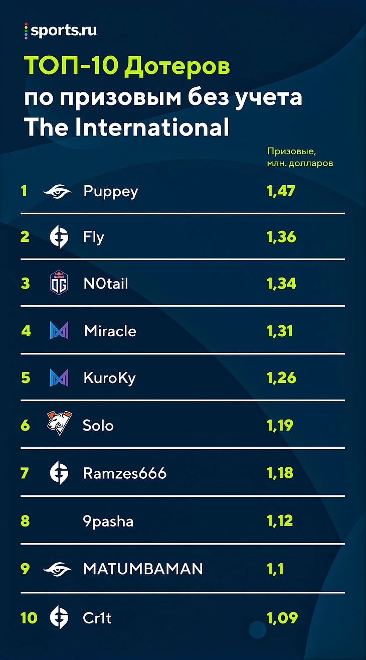 При этом игроки VP, как и Пуппей с Флаем – одни из немногих, кто большую часть призовых получил не за TI, а за множество побед и призовых мест на мейджорах. К слову, если учитывать деньги с TI, то они заняли бы следующие места: