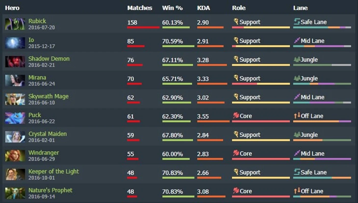 Да, Nisha играл на саппорте в стаке поляков, когда в команде еще был его брат (играл под ником Supream). Главные саппорт-сигнатурки керри Secret – Венга, ШД и Висп. К слову, так выглядит ститистика героев из пабов Ниши 2015-2016-хх годов.